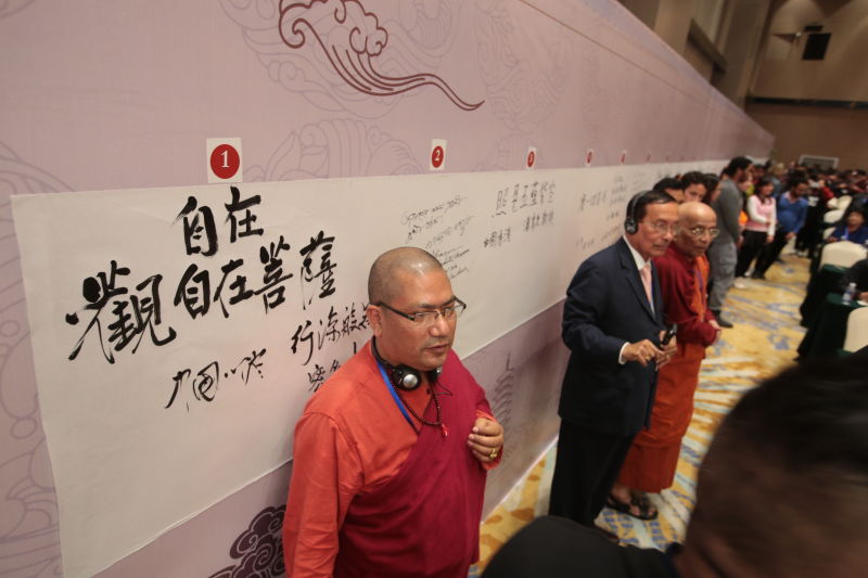 開幕式舉行了“一帶一路”沿線國家代表書寫《心經(jīng)》儀式,來自30個(gè)國家的學(xué)者、高僧、大使館參贊、留學(xué)生代表共同用本國語言書寫了《心經(jīng)》。并從多個(gè)角度加以研討,從這篇古代先哲引導(dǎo)人們追求至善至美至真的經(jīng)文中感悟不朽的精神境界,意義十分重大。